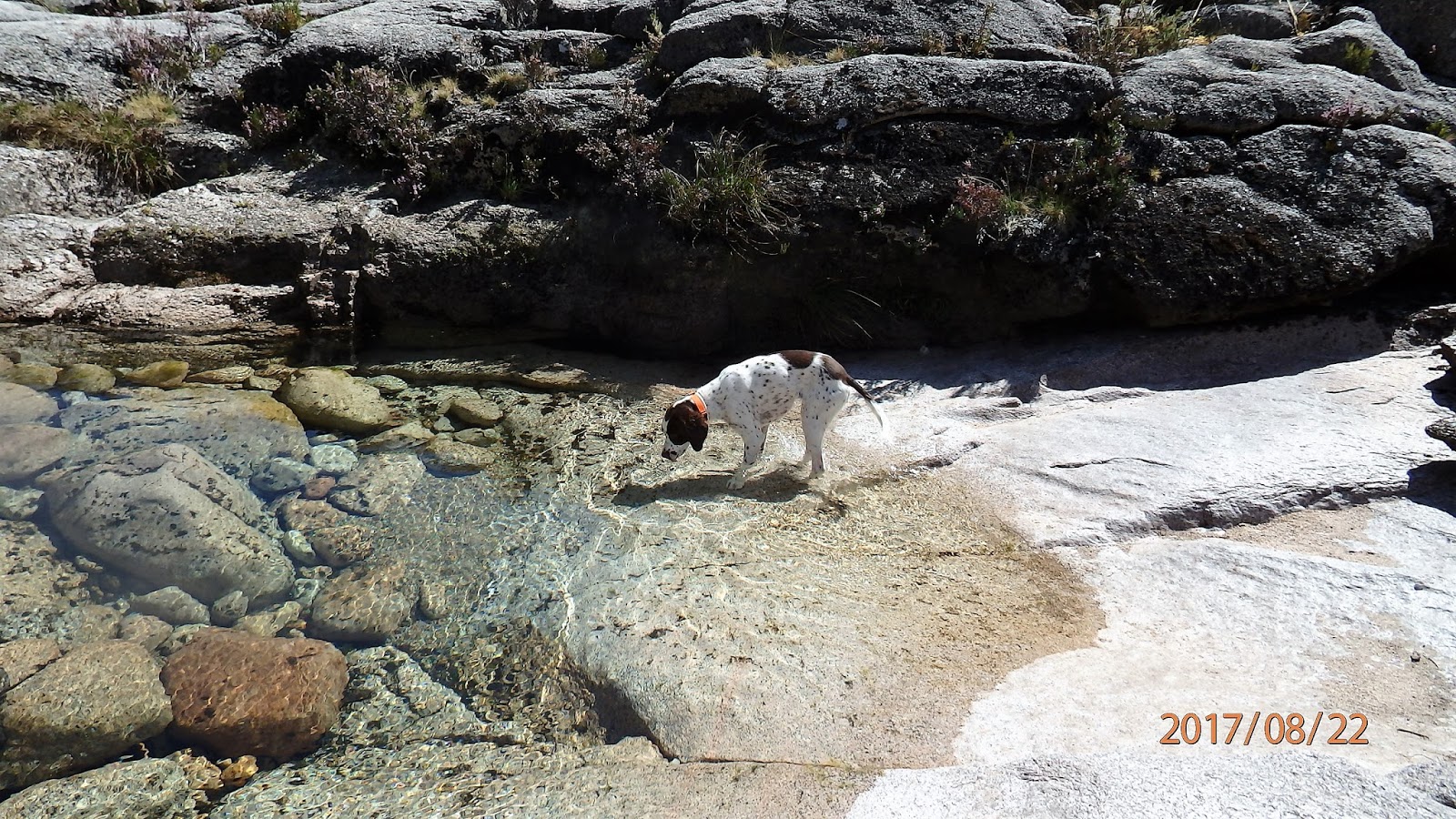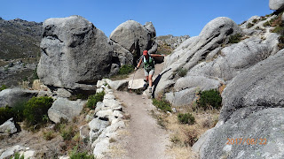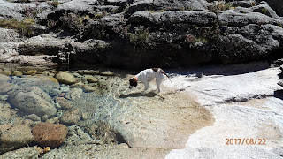 Botas ao caminho e lá fomos descobrir um belissimo trilho que era o mesmo que o pastor estava a trilhar com o seu grande rebanho de cabras e os seus dois cães. Paramos á conversa com o pastor e a Xica a fazer amizade com os cães, dois dedos de conversa interessante e lá continuamos até ás Lagoas para almoçar e refrescar pois o calor não dava tréguas.